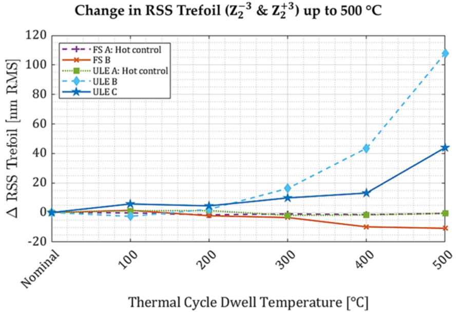 The surface figure of fused silica and Corning ULE wafers, imparted with ultrafast laser-generated stress, show negligible change even up to 200 C, suggesting that the stress is likely extremely stable at room temperature, consistent with our other work.